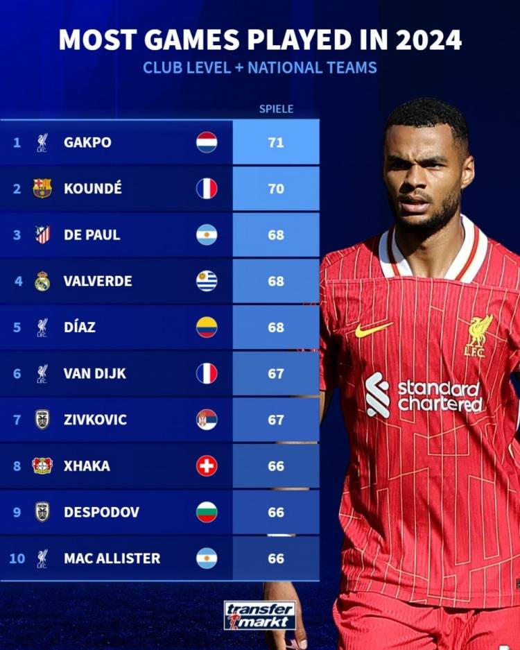 北京时间1月3日,德国《转会市场》盘点了球员2024年的出战场次(包括俱乐部与国家队),TOP10中利物浦占据4席,荷兰球员加克波以71场居首。