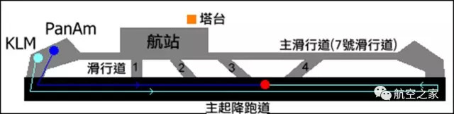 事故前4分46秒,泛美客机跟随荷航客机来到跑道上,泛美机长凭借着一张小图标寻找第3号出口位置,但出口的位置标识的并不清楚,雪上加霜的是,能见度越来越差,他们滑行到跑道时,便开始计算窗外的出口,他们顺利的通过了1、2号出口,问题出现在了第3出口。