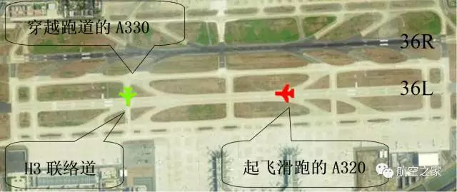 36L跑道正在起飞的A320飞机从穿越跑道的A330飞机的上空飞越,两机垂直间隔19米,A320左机翼与A330机尾间的水平位置投影间隔为13米。