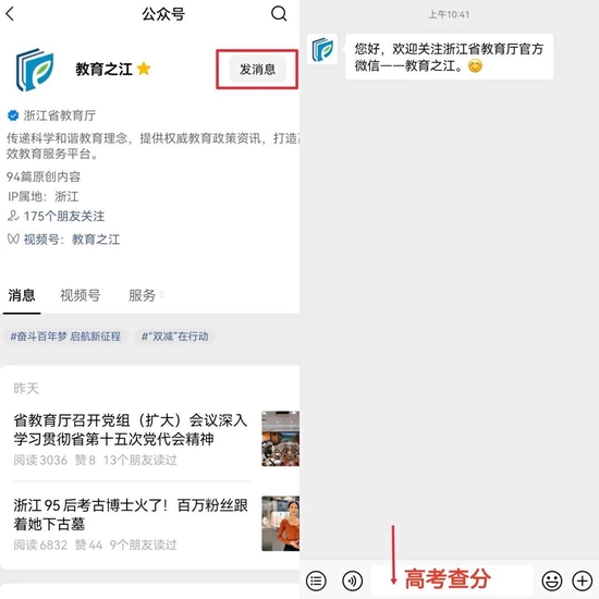 关注“教育之江”微信公众号,对话框输入“高考查分”。