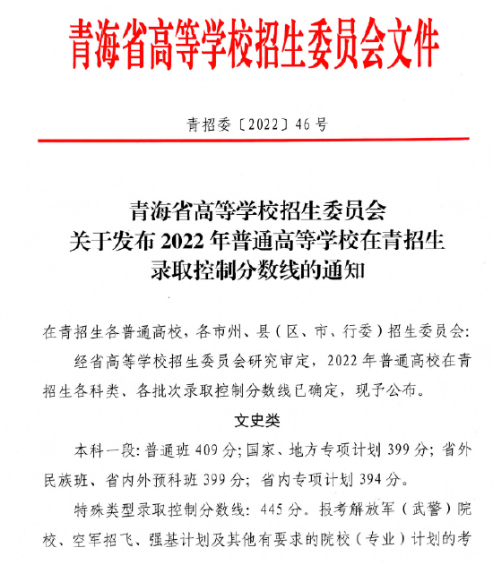 青海2022高考分数线:本科一段线文史409分理工335分 2022-07-18 23:07阅读: http://blog.sina.cn/dpool/blog/u/1629423820 青海2022高考分数线:本科一段文史409分 理工335分