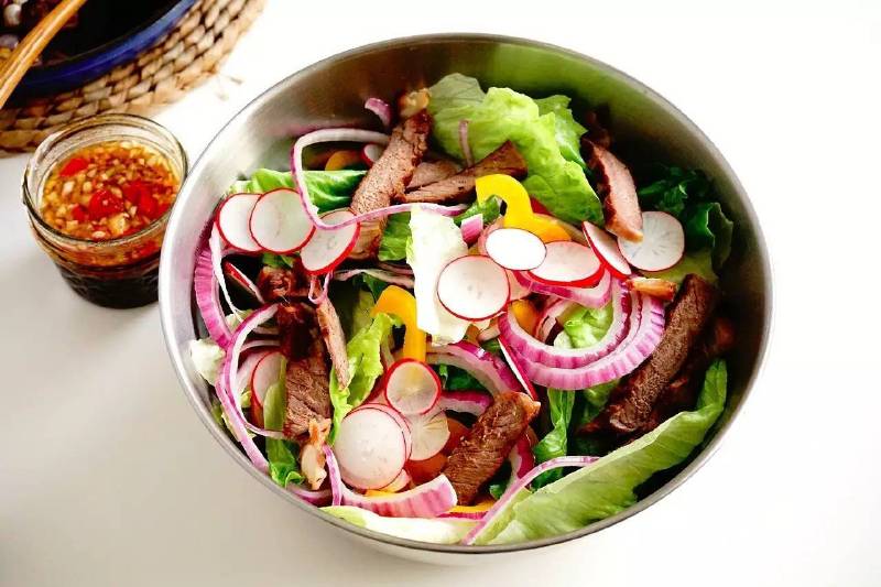 西冷牛排除了煎熟直接吃之外,还可以入菜。西冷偏瘦,放冷后不会有凝固的油脂,避免油腻口感,很适合做成牛肉沙拉。清脆爽口的各种蔬菜,搭配上嫩嫩的牛肉,浇上自制的酸辣汁,是一道很完美的健康餐哟~