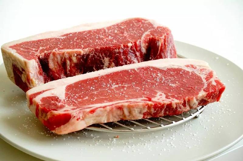去掉包装,牛排双面都撒上海盐简单按摩,置于晾网上放入冰箱冷藏间(4℃)解冻约20-48小时。目的是让牛排两面都与空气接触,排出多余水分。