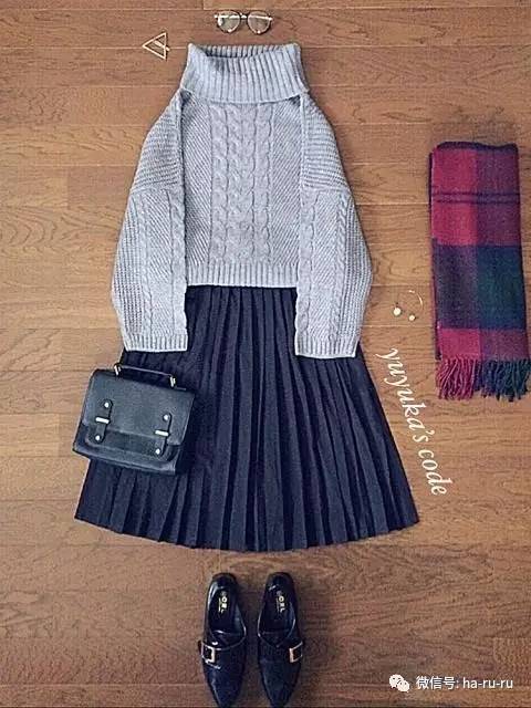 已经快变成裙装标配的百褶裙,搭配同样黑色的小包包和小皮鞋,然后再用流行的雾霾粉毛衣和格子围巾让整体气氛变得活跃起来,成为优雅少女。