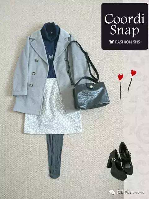 以灰色和灰色系为主的一色搭配。内搭藏青及浅色裙装,平衡整体色调。