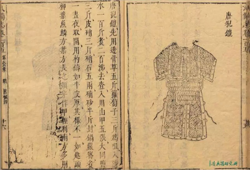 ▲《武备志》中抄袭自明代兵书《兵录》的唐猊铠图。从图像上看该甲甲片就是山文款式。但此甲的制作方法极为诡异,书中写道:“先用透骨草五斤,萝葡子三斤为咀,入清水一百斤,煮二百沸,去查,入川山甲五张,大同盐三斤,皮硝三斤,硝石五两,硵砂半斤,封锅严密,煮一昼夜。取开,用杓铸如牛皮厚,其样不一,如匙头、柳叶、鱼鳞、方叶、方长之类,穿做甲。轻利,南方多用。”最末一句里的匙头、柳叶、鱼鳞都是在《明会典》里提到过的铠甲佳叶类型;方叶、方长暂不知为何状。全文中再一次地还是与“山文”无一字相联系