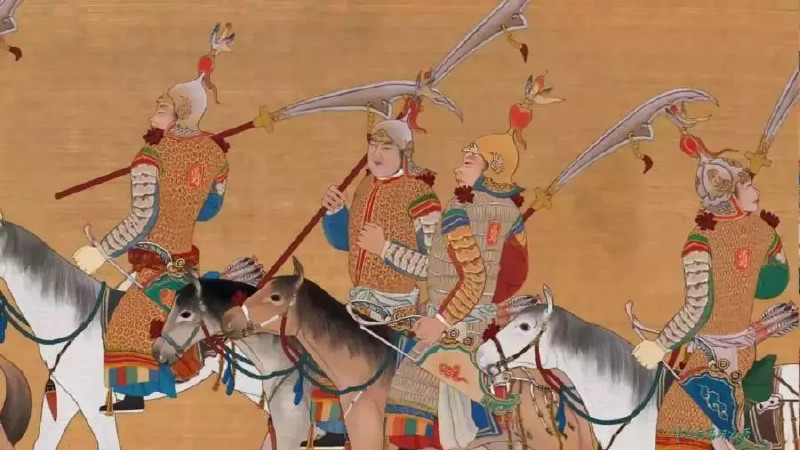 ▲《出警入跸图》局部之二,皇帝侍卫的盔甲式样并不统一,多种多样