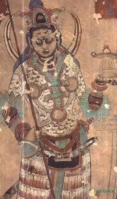 ▲唐朝敦煌帛画中的毗沙门天王,身着西域铠甲,肚脐下所横短弯刀,就是所谓吴钩,极有可能这种弯刀和天王的形象一样是外来文化,本来有外来名字,一般唐人不知如何称谓,故而就以他们习惯用在诗句中的吴钩称谓之