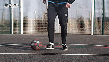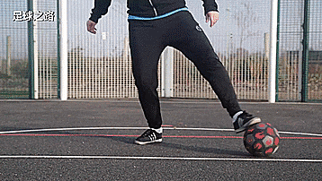 下面这个训练是三角拉球,先踩球将其拉回,然后用脚内侧从支撑腿后拨到身体一侧,最后再用另外一只脚拉回来。