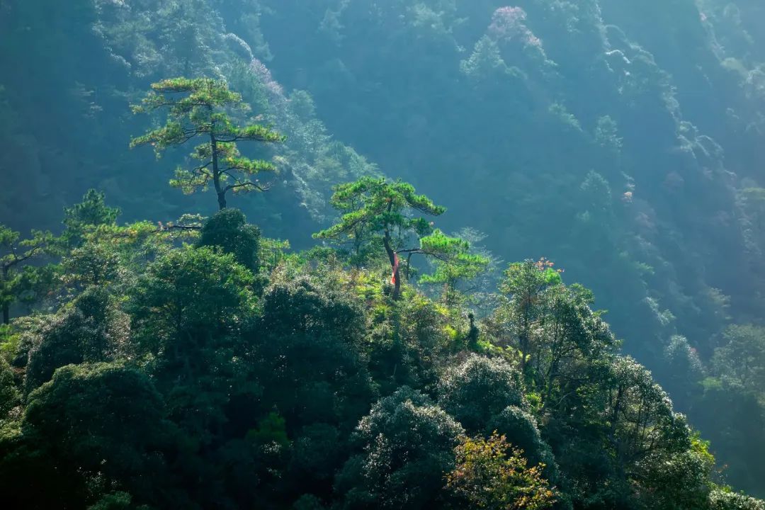 仙华山隐身在茂密的森林之中,只露出了俊朗的上身,好似在静静地探视远方。