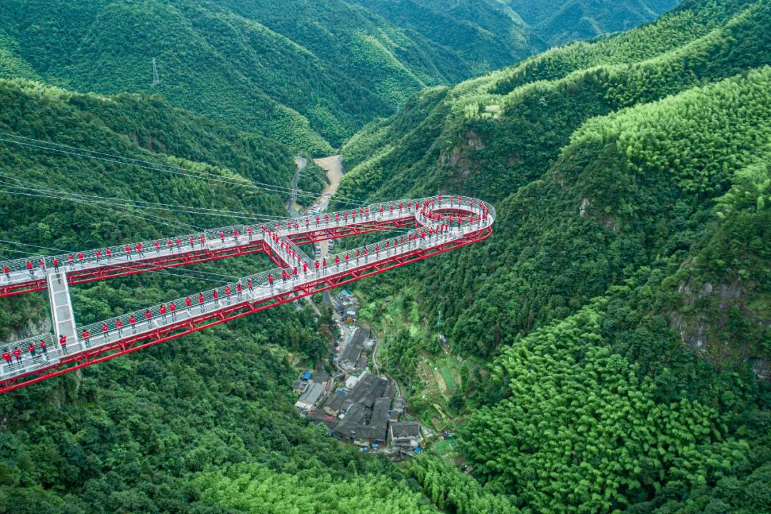 吉尼斯世界记录的高空悬廊上,举目远眺,崇山峻岭连绵起伏,郁郁葱葱的树木构成了一片绿色的海洋。