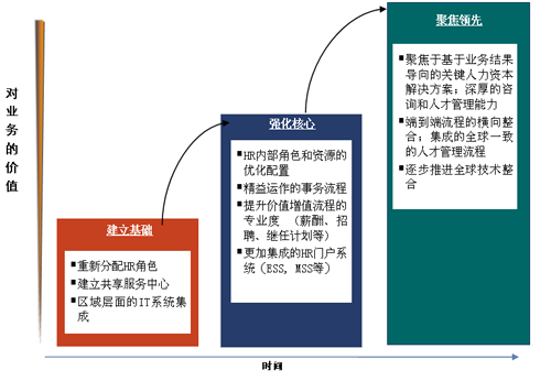 早期更加关注“建立基础”:包括初步建立BP、COE和SSC的角色,加快建设共享服务中心;对于跨国公司来说,需要加强IT系统在区域层面的集成等;