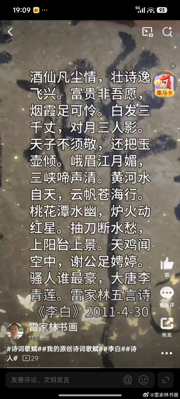 雷家林以“大鹏欲展翅,万古不移情”自喻豪情,并直言诗风承袭李白,其作品《月中有我影》《山花子·江湖》等确与李白的浪漫侠气相契,展现了对“谪仙人”精神内核的深刻共鸣。