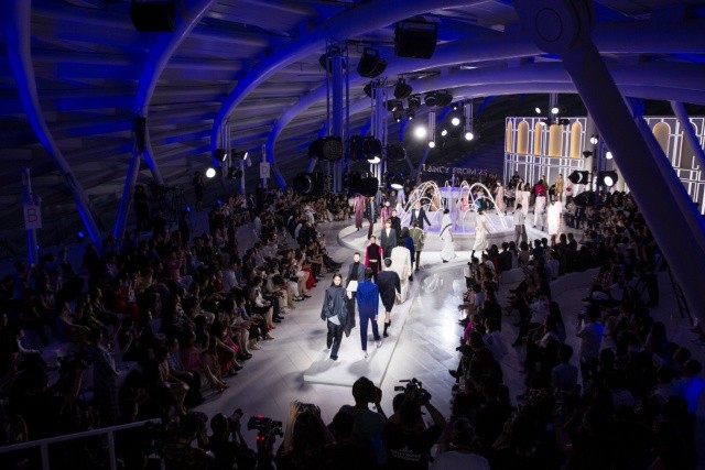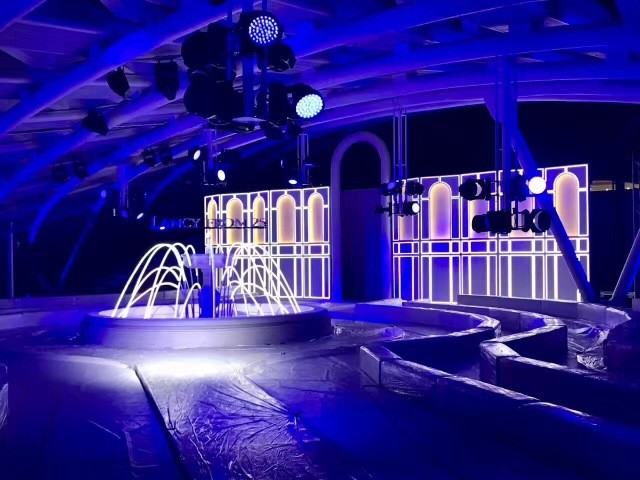 为了营造大秀主题[境]的所表达的空间感与氛围感,秀场大量采用静谧而深邃的蓝色,运用在秀场的地毯、背景墙、灯光效果以及整个空间的构造上,标志性的朗姿蓝在视觉上塑造了优雅、柔美、纯净的感官体验。现代感的线形设计勾勒了舞台轮廓,欧式复古喷泉点缀在T台中央,灵动而简约的设计呈现了现代与未来交融空间感。