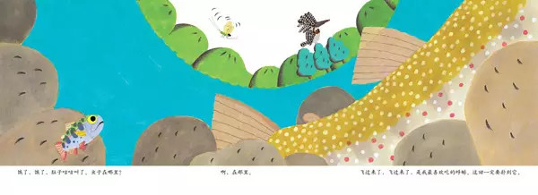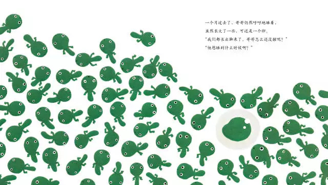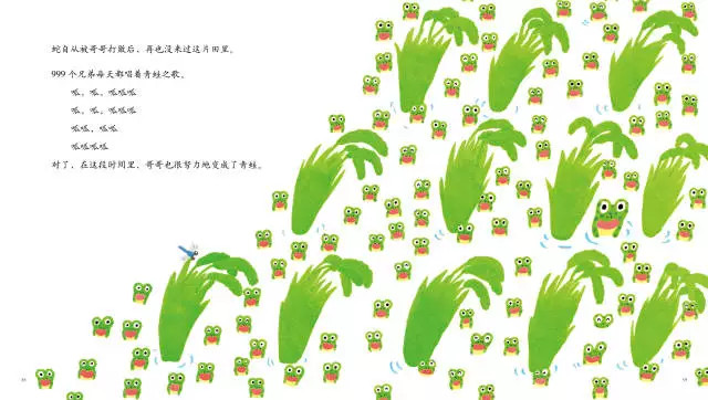 村上康成擅长以简约的平面化造型塑造栩栩如生的可爱形象:大眼睛的青蛙妈妈、爱睡懒觉的青蛙哥哥、超级有活力的青蛙兄弟们,甚至与故事无关的禾苗上的小瓢虫以及空中飞过的小鸟,都给人留下极深的印象。