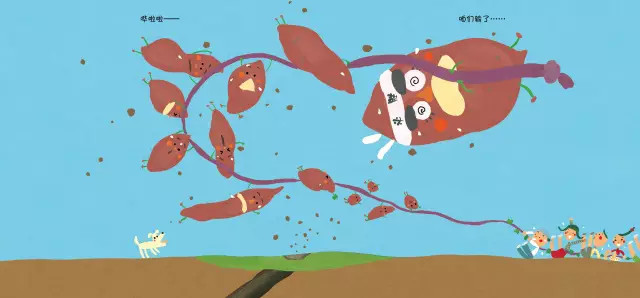 在丰收的季节,孩子们来到田地里跟红薯进行拔河比赛。