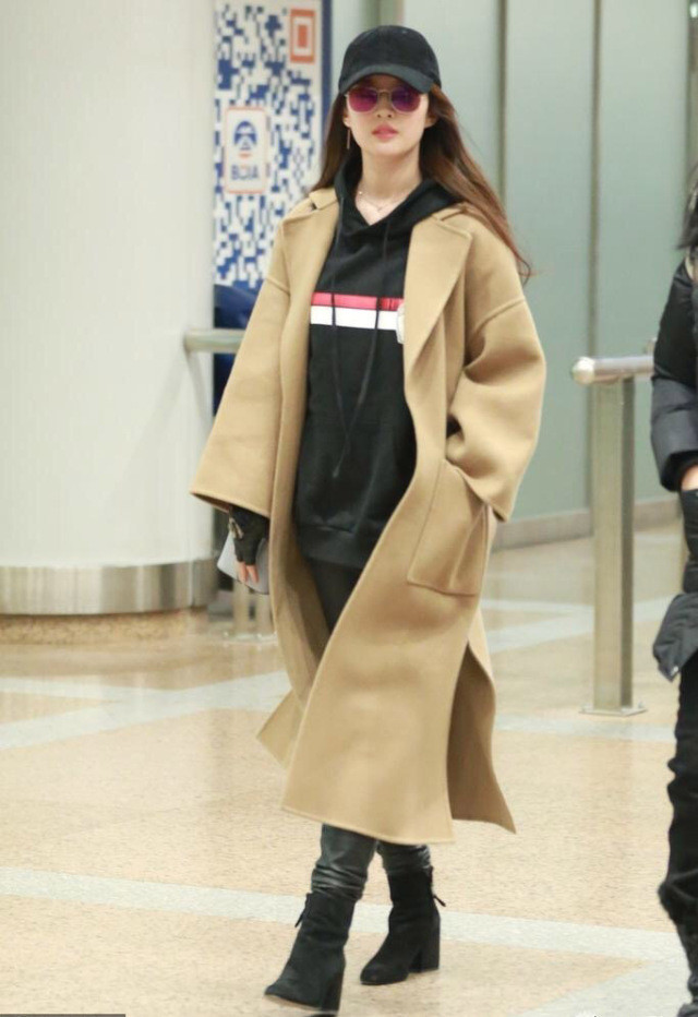 神仙姐姐换上卫衣墨镜棒球帽原来也可以这么帅,与经典的驼色大衣搭配毫不违和。
