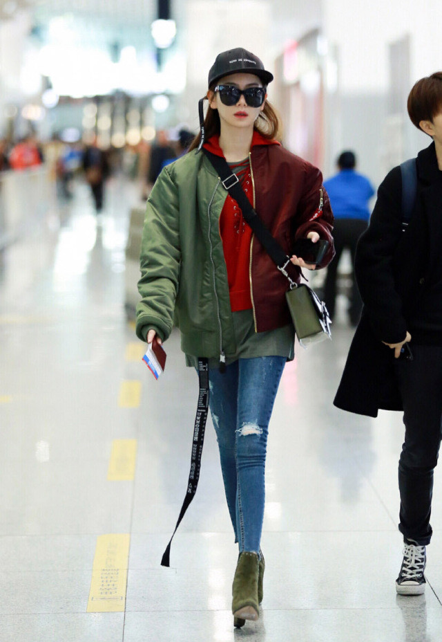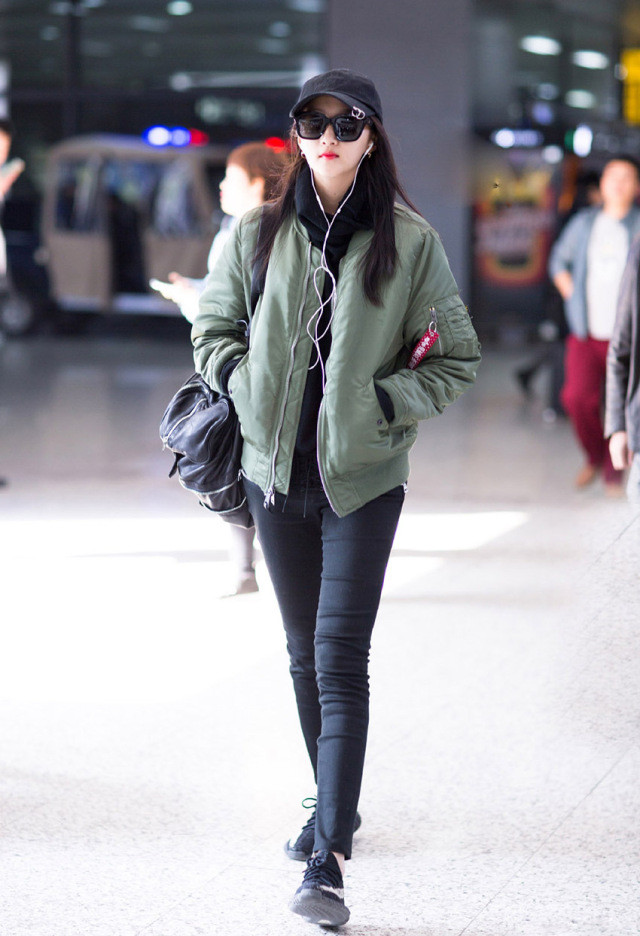 诗诗的机场私服一直比较接地气,真真是坐飞机去的…白&绿配色的卫衣与同色系运动鞋巧妙呼应,双排扣大衣穿出学院风。