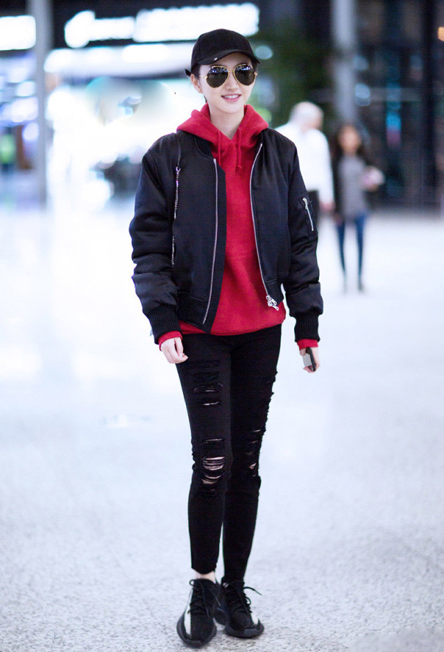 戚薇这件夹克厉害了,怕你看多了腻,给你整一双色的,还与卫衣包包鞋子完美撞色,给你100分不怕你骄傲。