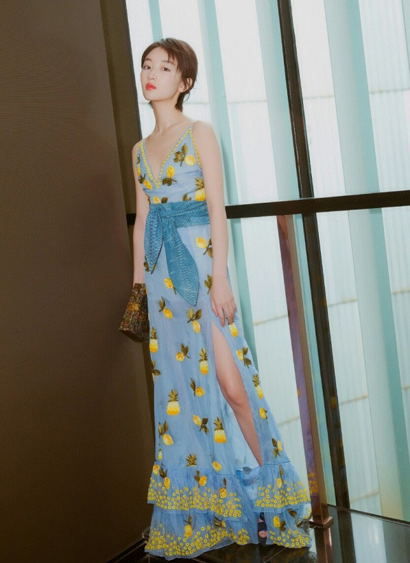 冬雨的红毯礼服一直是开挂级别的,目前为止都没见到她穿失败的红毯造型,这一身蓝色大开叉长裙,上面的黄色菠萝刺绣使她显得充满灵气与青春活力~