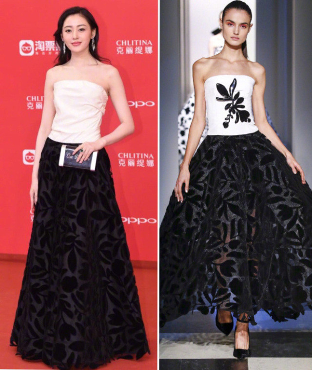 张天爱穿了一袭黑白礼服,上身束胸式抹胸设计搭配下身的镂空叶片大伞裙,简洁利落~
