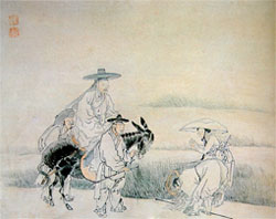 这幅画表现了在一个夏天一对农民夫妇遇见过田野的两班,恭敬地向他行礼的场景。一个两班头戴斗笠骑在毛驴上面轻蔑地往下看着农民夫妇,鬼机灵的仆人急忙拉着缰绳停下毛驴,其后面有一个仆人背着沉重的行李上气不接下气地跟在后面,露出嘲弄人似的笑脸,这些表情很诙谐,讽刺了两班一行的虚张声势。五体投地地鞠躬行礼的男人,轻轻地捧住两只手行礼的女人,很好地表现出拘泥于封建的身份关系的纯朴、老实巴交的农民的形象。