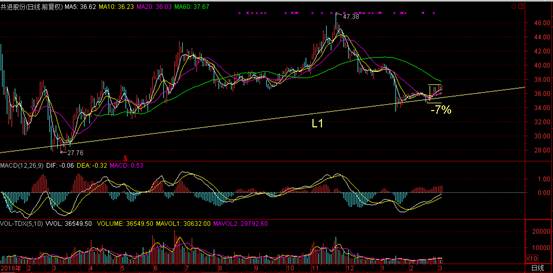 (9)止损:1)建仓个股须满足买入价不远下方有重大支撑(例图中上升趋势线L1的支撑)的必要条件,量化为从买入价附近高点(例图中上面水平短线)回撤7%的回撤线(例图中下面水平短线)须在支撑位之下(见图);2)买入后若股价上涨,则遵循止赢原则,若回撤,则实质性跌破支撑位止损,最后止损位为买点附近最高价回撤7%。为止损定量化原则就是技术上的安全边界。如追高买入个股,股价回撤时支撑位距股价会很远,通常会进退失据。