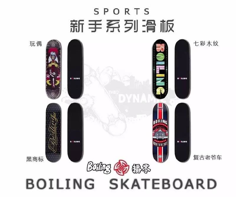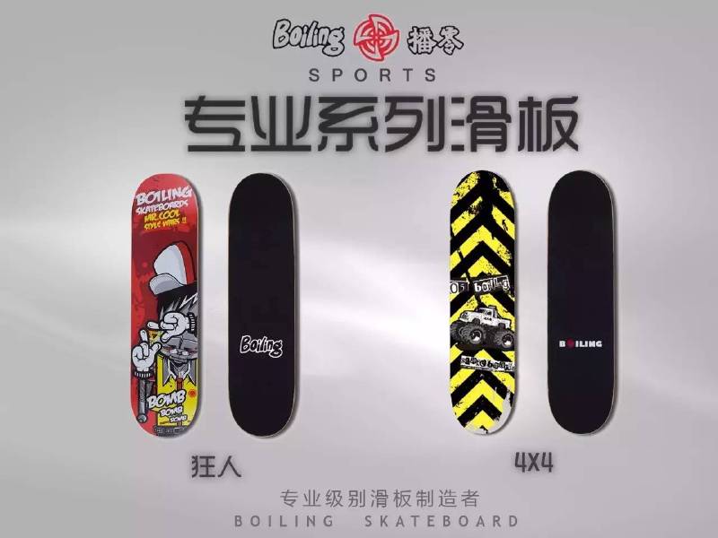 Skateboard。自2000年创立以来,始终秉承沸点“中国原创”的品牌理念,图案以手绘卡通为主,所有图案与设计者均来自国内,每年都不定期推出一些原创题材的滑板设计,引导初学者感悟滑板文化的魅力。