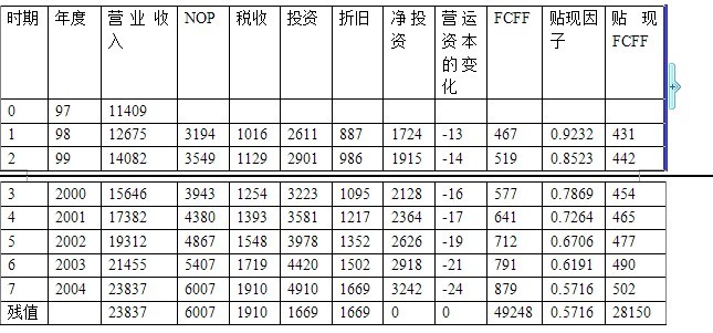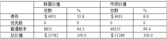 假设麦当劳的税前债务成本是6.8%,与同期国债之间存在1%的利差;它的税后债务成本是4.64%[等于6.8%*(1-0.318)];没有未清偿优先股,普通股成本是8.71%。下面你将会看到,我们不是像变魔术一样很随便地就从罗纳德。麦当劳的帽子中取出那些价值。在上面这些假设之下,根据普通股的市场价值权数以及债务和优先股的账面价值权数,麦当劳公司在1998年6月1日的WACC是: