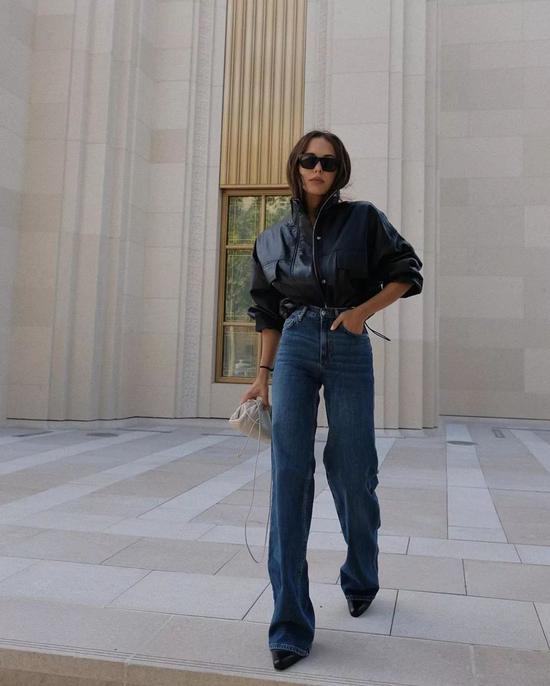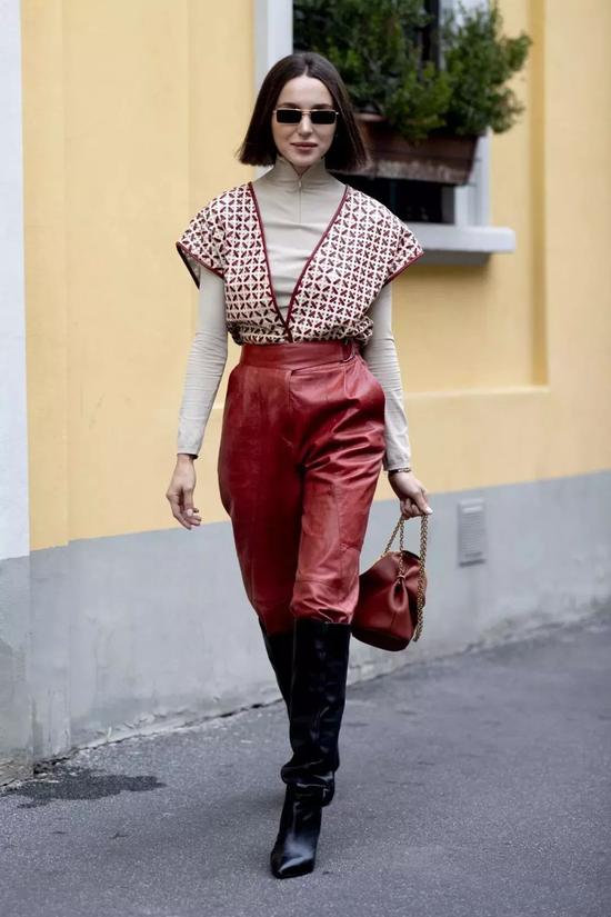 硬朗质感的皮革单品,没有过多的装饰元素,搭配线条笔直流畅的上衣,会更具气场和派头。