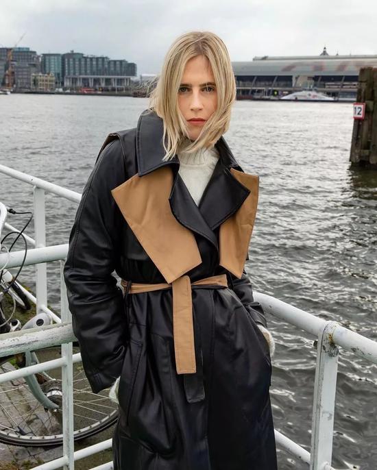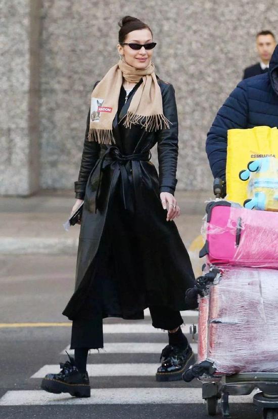 皮革风衣,Bella Hadid就用皮风衣展现自己的“蜂腰”,轻软的质感让风衣收放自如,轻飘飘看上去更具女人味。
