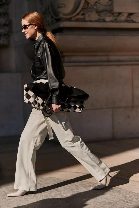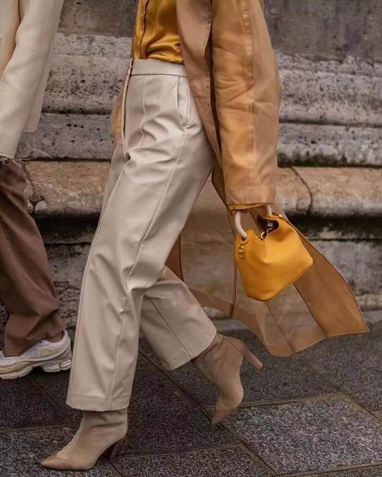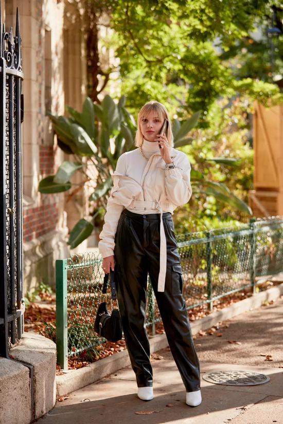 搭配同色系的裤子看起来利落又温柔。你以为全身穿皮革会过于犀利?偏偏优雅又大气!