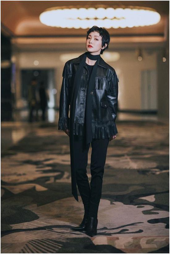 女明星就更是会穿了! 比如郭采洁这身虽然都是黑色的,但是运用了不同的材质,整体的造型就黑得很有层次感。