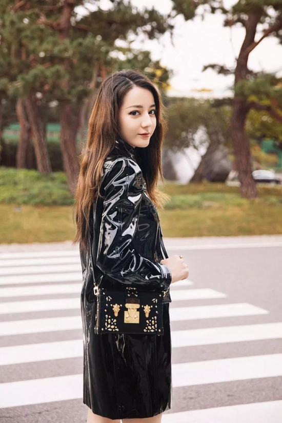 迪丽热巴这件飒爽的漆皮皮衣 ,泛着漆光的皮革拼接元素,像被加持了更多的光洁,闪耀着时髦的风彩。