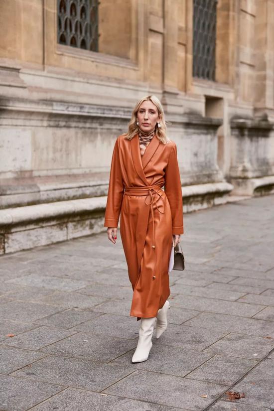 浴袍式皮衣更为贴身,用亮色给整体提亮,更有一种one-piece感。