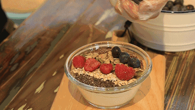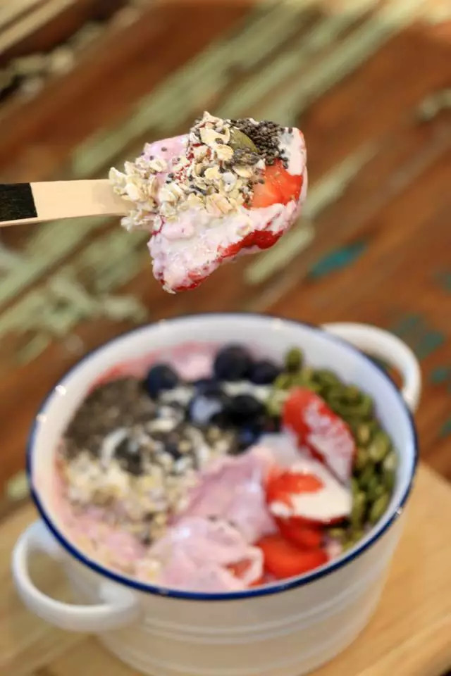 配料:酸奶、蓝莓、树莓、燕麦、齐亚籽、南瓜子、葵花籽、蜂蜜
