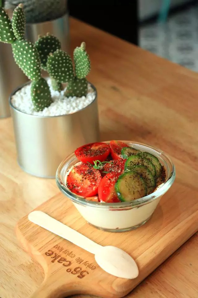 配料:酸奶、圣女果、黄瓜片、意大利香醋、帕玛森奶酪、橄榄油、海盐、黑胡椒