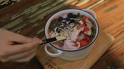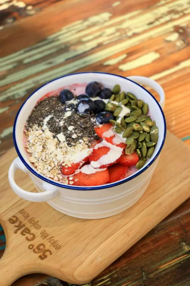 配料:蓝莓、草莓、麦片、烤南瓜籽、齐亚籽、淋奶油