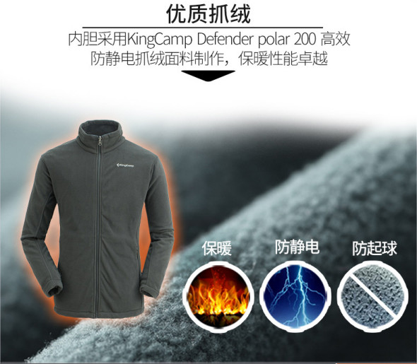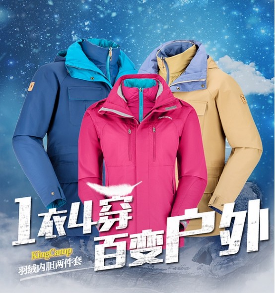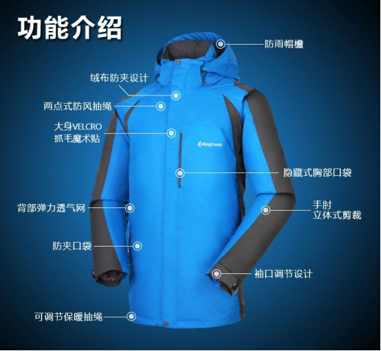 特点:单穿外套防风防雨且易于携带,单穿内胆休闲保暖,内外结合则可应付严寒、暴雨等复杂的场合。缺点是携带略嫌不便。不过就其实用度来说,无论是户外探险、旅游休闲还是日常穿着,都是不错选择。