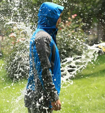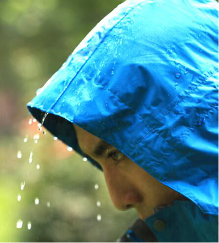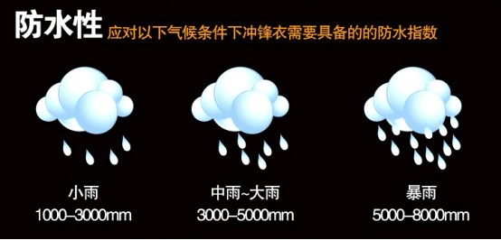 在户外碰上下雨,是再平常不过的事。冲锋衣防水性能的强弱,最直观的了解方法是看它的防水指数,先简单了解一下这个指数:它的单位是毫米水柱压强,通常的解释是,当10000mm高的水柱压在面料上,24小时内从面料渗出的水不超过3滴,那么我们就认为这件衣服的防水指数是10000mm。