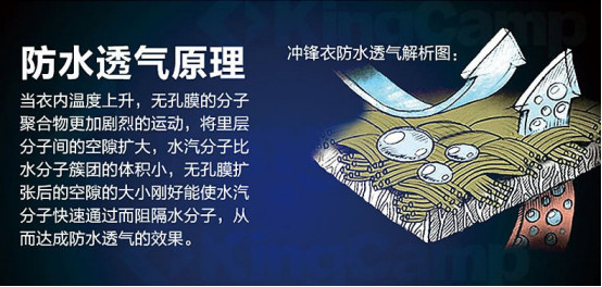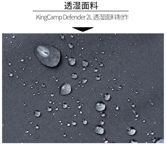 KingCamp自有防风防水透气面料,由一种亲水性无孔的合成材料,与表布贴合形成的面料,具有独特的防风,防水透气性能。