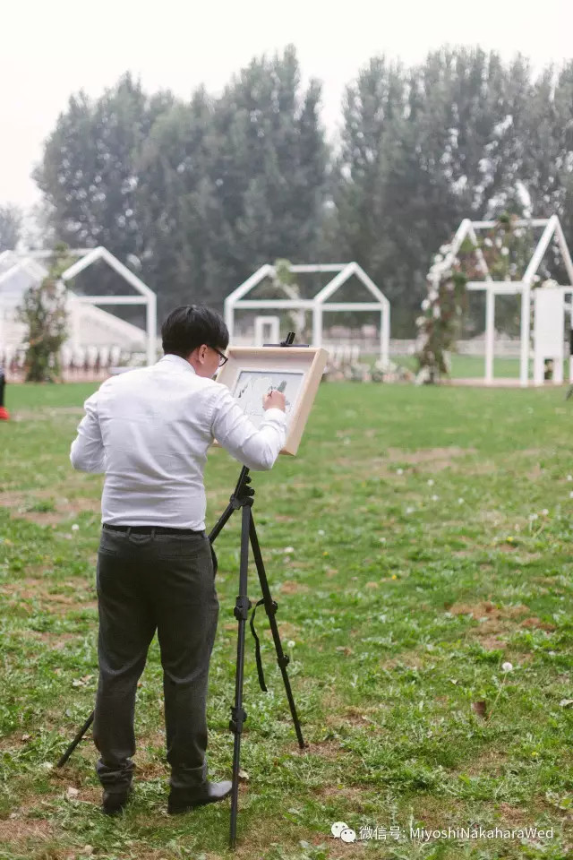 签到的地方是在马场的林道上,在这林道的中央搭了一个小舞台,并请新人的好朋友来为到场的来宾演奏了钢琴曲。这一天早上下了雨,在朦胧的空气里此区域看起来格外的梦幻。