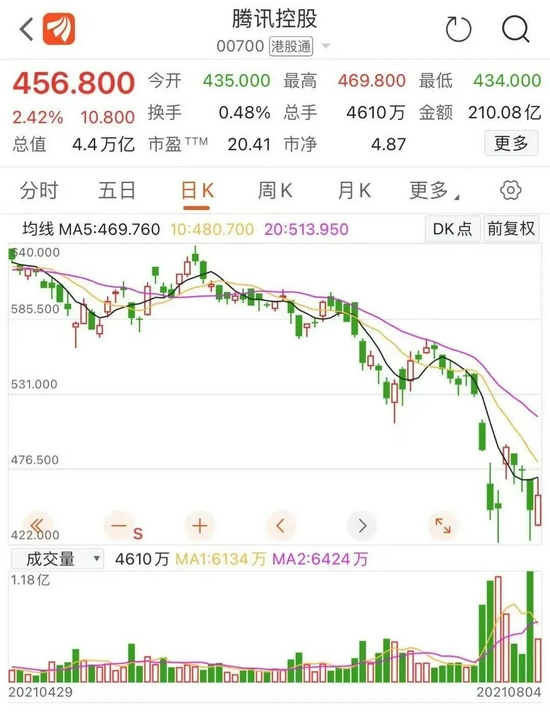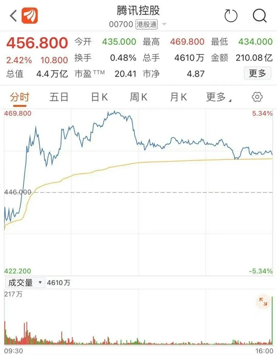 4日早盘,腾讯控股股价一度大跌近3%,随后直线拉升,腾讯股价一度大涨5%,截至收盘涨2.42%。