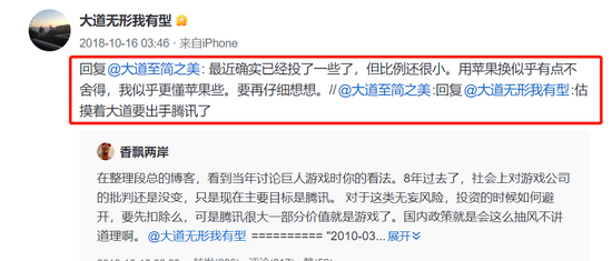 一直到2018年腾讯大跌期间,段永平开始少量买入腾讯。“最近确实已经投了一些了,但比例还很小。用苹果换似乎有点不舍得,我似乎更懂苹果些。要再仔细想想。”