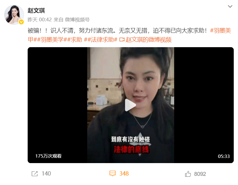 2025年7月3日凌晨,知名演员赵文琪在微博发视频自曝被合伙人欺骗利用:“被骗!识人不清,努力付诸东流。无奈又无措,迫不得已向大家求助。”