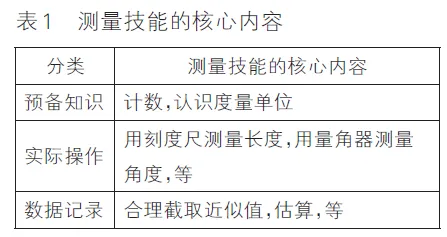 笔者将测量技能定义为利用工具计量物体某种属性的操作活动方式。以活动前、活动中、活动后作为划分依据,进而着重研究测量的基础知识、实际的测量活动、测量数据的记录等有关测量技能的几个核心内容(具体参见表1)。