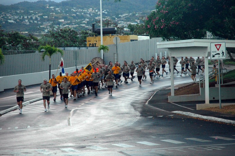 罗伯特·威拉德上将(一排中心者)带领基地一众官员参加拉练长跑。