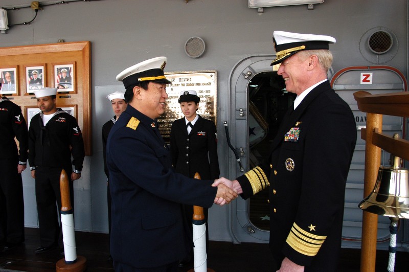 罗伯特·威拉德上将在第七舰队旗舰“蓝岭”号上接待到访中国海军高层。