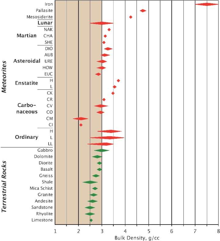 7、绝大多数陨石的密度大于3,但CI碳质球粒陨石的密度只有2.2,给人一种“骨质疏松”的感觉。