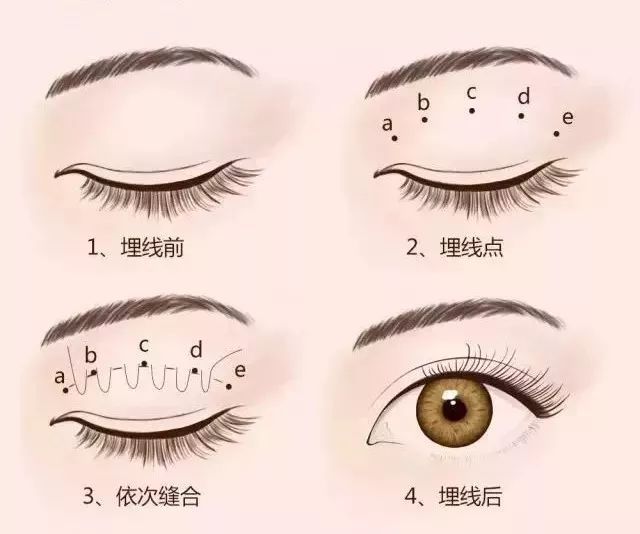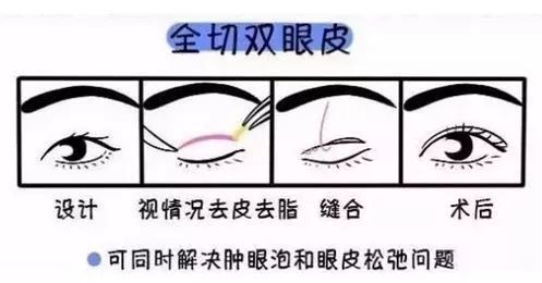 目前市面上常见的双眼皮手术:埋线式、全切式、三点式。